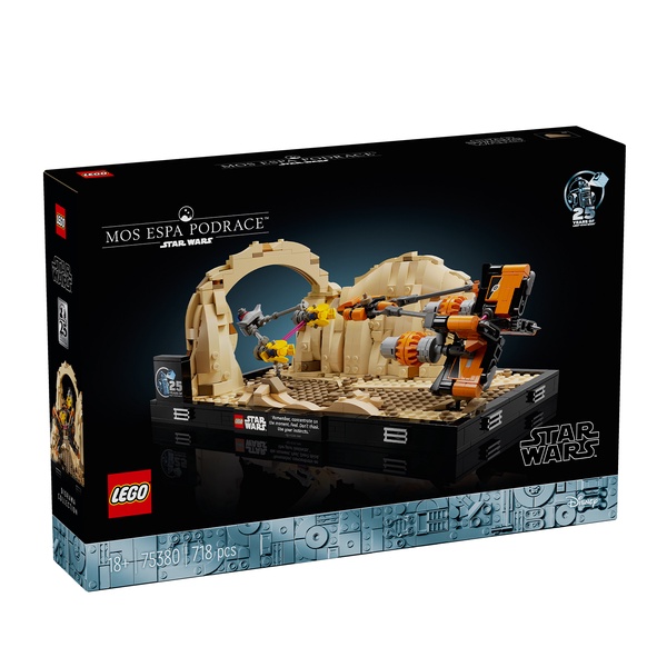 Freeze-frame a moment from the thrilling Mos Espa Podrace with this LEGO® Star Wars™ Diorama (75380) buildable model kit for adults. This collectible building set invites you to channel the force, as Anakin Skywalker did in the Star Wars: The Phantom Menace adventure, to create a LEGO brick-built snapshot of his Podracer powering through Arch Canyon in hot pursuit of his racing rival Sebulba.The impressive build-and-display model comes with a plaque bearing Qui-Gon Jinn’s advice (“Remember. Concentrate on the moment. Feel. Don't think. Trust your instincts.”) and a LEGO Star Wars 25th anniversary brick.Enhance your creative building experience with the LEGO Builder app, which lets you zoom in and rotate a 3D digital version of this construction model as you build – and more.This buildable model is part of a collection of LEGO Star Wars sets for adults, including other dioramas depicting epic scenes, and makes a top gift for yourself and other adult Star Wars fans.