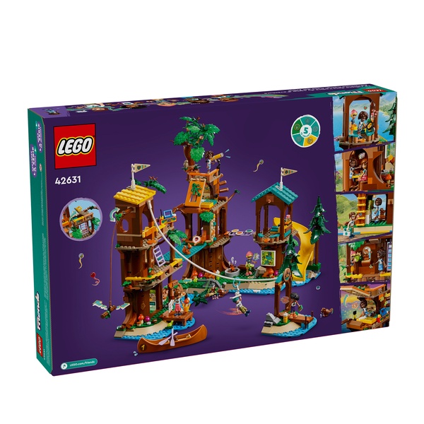 The LEGO® Friends Adventure Camp Tree House (42631) camping playset toy is packed with stories for girls and boys aged 8+. Kids can tell the story of friends Leo, Aliya, Jamila and Olly as they try exciting new activities under the guidance of camp counselor Jonathan.The building set is filled with fun features for creative play and comes with 5 mini-dolls, accessories and lots of animal figures, including 2 beavers who are building a dam. Send the characters whizzing down the zip line or help them navigate the obstacle course with its log bridge, climbing wall and trapdoors. There are also activities like canoeing, plus an island that can be reached by boat or zip line!