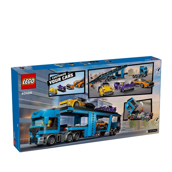 Toy Vehicle Transporter Treat a toy car enthusiast to this LEGO® City Car Transporter Truck with Sports Cars (60408) building set for ages 7 and up. This multi-vehicle playset features a toy car transporter truck with a detachable dual-level trailer for transporting the classic ’50s-style tail dragger,’70s-style muscle car and sleek electric supercar included with the set, plus 4 minifigures for imaginative role play and storytelling. Just Like the Real Thing! The toy transporter truck is packed with authentic functions for realistic play. Kids can tilt the driver’s cab to access the engine, hitch the trailer, deploy stabilizing support struts and drop the upper deck and lower deck ramps to board vehicles on 2 levels. The truck seats 2 minifigures and kids can also seat a minifigure in each of the 3 sports cars before lining up the vehicles for epic race action!