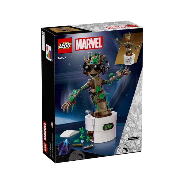 LEGO® Marvel Dancing Groot (76297) is a buildable Guardians of the Galaxy toy with an interactive dancing function. It makes a great gift for kids aged 10 and up who are fans of the Marvel character Groot, Super Heroes and buildable LEGO toys. This Groot building toy for kids has a movable head and posable arms. When kids turn the handle at the back of the flower pot, the jointed Groot starts dancing. The figure can be customized with additional leaves, buildable headphones and sunglasses, and kids can personalize Groot’s pot by adding 1 of 3 different nameplates to the front (including one related to the TV show I am Groot). All of these accessories can be stored in the pot’s built-in compartment.