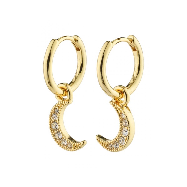 Gold-plated hoops with sparkling half moon pendants. The earrings' unique shape and sparkling Preciosa crystals give you a true luxury boho feel, easily styled with light summer dresses and layered bracelets. The earrings have an easy-to-use click clasp and are made from min. 75% recycled material. Wear them with or without a moon pendant depending on the outfit and occasion.