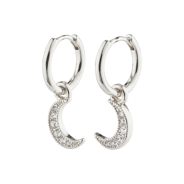 Silver-plated hoops with sparkling half moon pendants. The earrings' unique shape and sparkling Preciosa crystals give you a true luxury boho feel, easily styled with light summer dresses and layered bracelets. The earrings have an easy-to-use clickclasp and are made from min. 75% recycled material. Wear them with or without a moon pendant depending on the outfit and occasion.