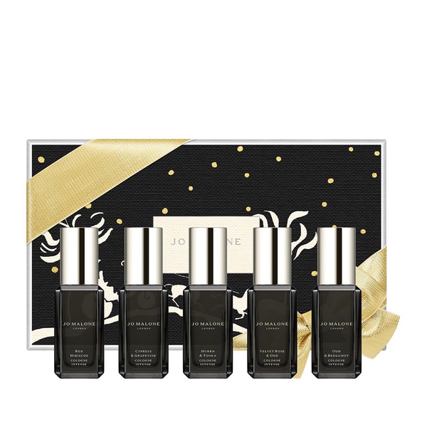 The decorative festive gift box contains: sensuous Myrrh & Tonka, decadent Velvet Rose & Oud and three other fragrances: Red Hibiscus, Cypress & Grapevine, Oud & Bergamot inspired by faraway lands, captivating rituals and treasured ingredients.