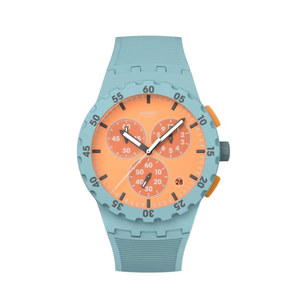 This chronograph sports a light orange dial with dark orange subdials, dark green hour, minute and subdial hands with glow-in-the-dark effect, a white seconds hand and a date window between 4 and 5 o'clock. The matte light green case features a matching bezel with dark green print and multi-colored crown and pushers. It is complemented by a structured matte light green strap with matching loop and buckle.