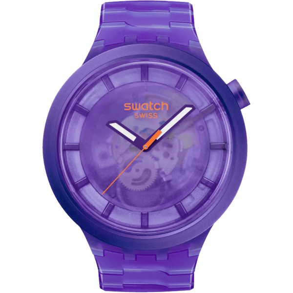 This oversize purple watch boasts an allover transparent look from its biosourced case, dial, and bezel to its biosourced bracelet with butterfly buckle. The transparent purple biosourced dial gives a view of the movement while purple hour and minute hands with glow in the dark and a contrasting orange seconds hand tell the time under the biosourced glass.