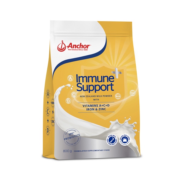 Anchor Immune Support, made; from the goodness of New Zealand dairy milk, fortified with vitamins A, C and D, as well as iron and zinc, to support a healthy immune system. Creamy and delicious. This high quality; milk powder also contains added probiotic DR10™.