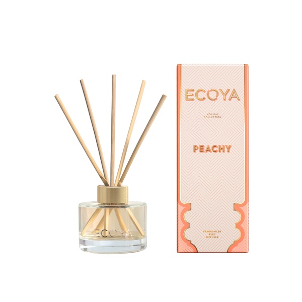The Mini Diffuser is designed to fill your space with long-lasting fragrance. Housed in a petite glass vessel with a brushed gold collar. Featuring five natural reeds and diffusing fragrance for up to three months. Available in our three Holiday Collection fragrances, Fresh Pine, Pear & Brandy and Peachy. A peachy sun-kissed paradise. Juicy peach, summer berries and tropical pineapple with hints of orange blossom and a touch of gardenia. It’s a peach beach party and everyone is invited.