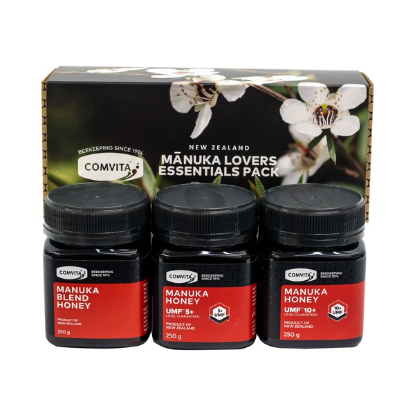 This set contains: 1 x Comvita Manuka Blend Honey MGO 30+ 250g, 1 x Comvita UMF 5+ Manuka Honey 250g, 1 x Comvita UMF 10+ Manuka Honey 250g