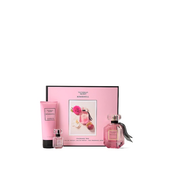 Undeniable fragrance, times three. Embrace your inner bombshell with the intoxicating notes of fresh-cut peonies, sparkling purple passion fruit, and creamy vanilla orchid in this fragrance trio. Includes a full-size and mini-size Eau de Parfum as well as a fine fragrance lotion.
