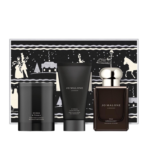 This set contains: Hypnotic Oud & Bergamot in a 50ml Cologne Intense, evergreen Cypress & Grapevine in a 50ml body & hand wash and a captivating Myrrh & Tonka Travel Candle. All wrapped up in an elegant gift box.