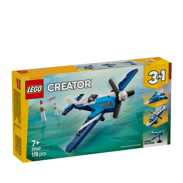 Superfast adventures in the sky await boys and girls aged 7 plus with the LEGO® Creator 3in1 Aircraft: Race Plane (31160) toy playset. The plane model has a rotating propeller at the front, moving wheels so it can travel on the ground, and a brick-built stand for display.Kids can choose to build 3 different awesome vehicles: an airplane toy with a rotating propeller and moving wheels; a jet plane toy with moving wheels; and a helicopter model with a spinning rotor blade. Each model can be displayed on a brick-built stand and the set is an impressive gift for kids who enjoy playing out imaginative action-packed stories.LEGO Creator 3in1 sets are great gifts for kids with 3 different models to create and recreate in every box. These 3in1 transforming toy sets let them enjoy imaginative play and offer an impressive range that appeals to their biggest passions, including supercool vehicles, amazing animals and detailed houses. Please note that models cannot be built simultaneously.