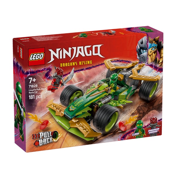Delight your little ninja with the first ever NINJAGO® pull-back race car toy! Boys and girls aged 7 and over can recreate superfast action from season 3 of the NINJAGO Dragons Rising TV show with Lloyd’s Pull-Back Race Car (71828) by pulling it back, releasing it and watching it speed forwards. The sleek race car has 4 tyres, a cockpit for a minifigure and is decorated with green lightning blades.