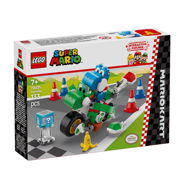 Rev up for thrilling drive-and-drift action with this collectible LEGO® Super Mario™: Mario Kart™ – Yoshi Bike adventure toy playset for kids (72031). An exciting Nintendo® gift idea for boys, girls and gamers aged 7 and over, the set features a brick-built model of the Yoshi Bike and, for the first time in a LEGO Super Mario set, a Light-Blue Yoshi toy figure. Help Light-Blue Yoshi drive the bike between 4 traffic cones, launch shells from the bike and swerve around the Banana.