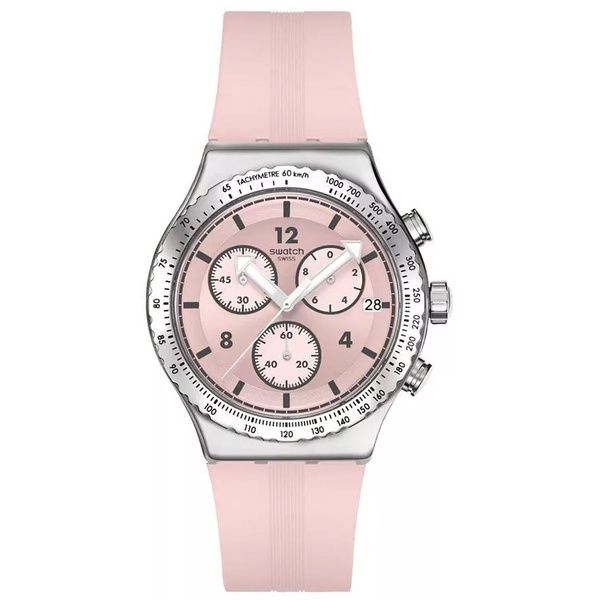 This stainless steel chronograph features a light pink sun-brushed dial with light pink subdials, black printed numerals and hour markers and a white date window with black print at 3 o'clock. Arrow-shaped, silver-colored hour and minute hands with glow-in-the-dark effect and a white chronograph seconds hand tell the time. It has a shiny stainless steel case and bezel with black printed tachymeter scale. A structured, matte light pink strap with matching loops and shiny stainless steel half-buckle complete the watch.