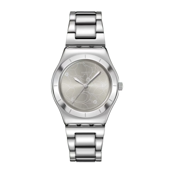 This sleek, stainless steel timepiece features a gray sun-brushed dial with a printed white floral pattern, silver-colored hour and minute hands with glow-in-the-dark effect and a silver-colored seconds hand. The watch has a polished stainless steel case and matching bezel with engraved hour markers. A polished stainless steel bracelet with butterfly buckle finishes the look.