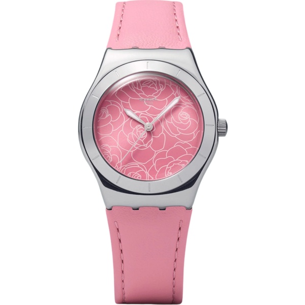 This sleek, stainless steel timepiece features a pink sun-brushed dial with a printed white floral pattern, silver-colored hour and minute hands with glow-in-the-dark effect and a silver-colored seconds hand. The watch has a polished stainless steel case and matching bezel with engraved hour markers. A pink leather strap with pink stitching, pink leather loop and polished stainless steel buckle finish the look.