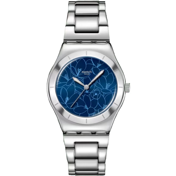 This sleek, stainless steel timepiece features a blue sun-brushed dial with a printed light blue floral pattern, silver-colored hour and minute hands with glow-in-the-dark effect and a silver-colored seconds hand. The watch has a polished stainless steel case and matching bezel with engraved hour markers. A blue leather strap with blue stitching, blue leather loop and polished stainless steel buckle finish the look.
