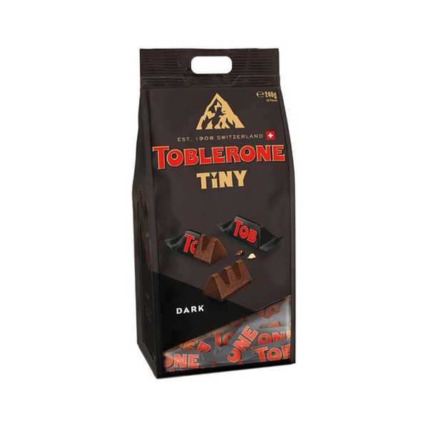 Toblerone Tiny Dark - delicious dark chocolate with honey and almond nougat - offered in a shiny, travel exclusive black bag of 30 individually wrapped snack-sized pieces. Dainty and decadent!