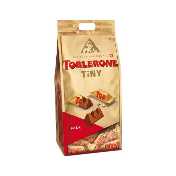 Toblerone Tiny - the iconic milk chocolate with honey and almond nougat - offered in a shiny, travel exclusive golden bag of 30 individually wrapped perfectly snack-sized pieces.