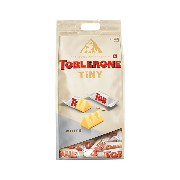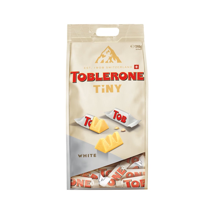 Toblerone Tiny White - the iconic white chocolate with honey and almond nougat - offered in a shiny, travel exclusive white bag of 30 individually wrapped snack-sized pieces - a convenient treat for white chocolate lovers.