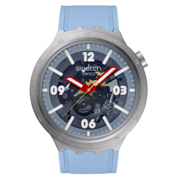 This oversize watch stands out with its transparent dial featuring a light blue sparkling outer ring, white printed indexes and numerals with glow-in-the-dark effect, and a light blue printed minute track. Red hour and minute hands with glow-in-the-dark effect and a gold-colored seconds hand point to the time. The sandblasted stainless steel case with matching bezel and pusher is complemented by a textured, matte light blue strap with matte light blue loops and a sandblasted stainless steel half-buckle.