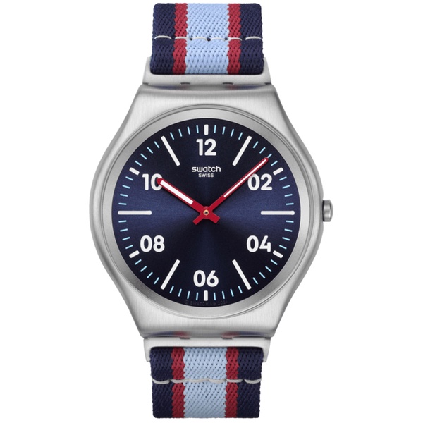 This ultra-slim watch features a dark blue dial with sun-brushed finishing, silver-colored flange, white printed indexes and numerals, light blue printed minute track, and burgundy hour and minute hands with glow-in-the-dark effect. The sandblasted stainless steel case, loops, and half-buckle are complemented by a dark blue, burgundy, and light blue striped textile strap.