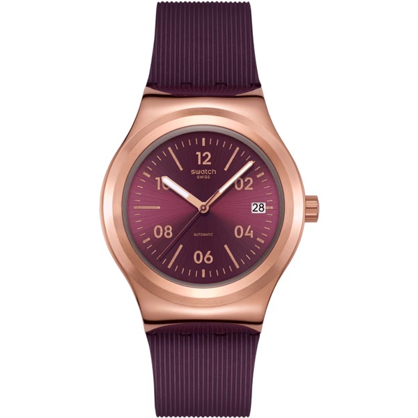 This automatic watch sports a burgundy dial with sun-brushed finishing, sparkling light purple printed indexes, numerals, and minute track, and date window at 3 o'clock. Rose-gold colored hour and minute hands with glow-in-the-dark effect and a brown seconds hand point to the time. The shiny stainless steel case with rose-gold colored PVD is complemented by a matching bezel and gives a view of the SISTEM51 movement with digital printed design on the back. A textured burgundy strap with Anodamazing effect, matte burgundy loops, and a brushed stainless steel half-buckle with rose-gold colored PVD complete the look.