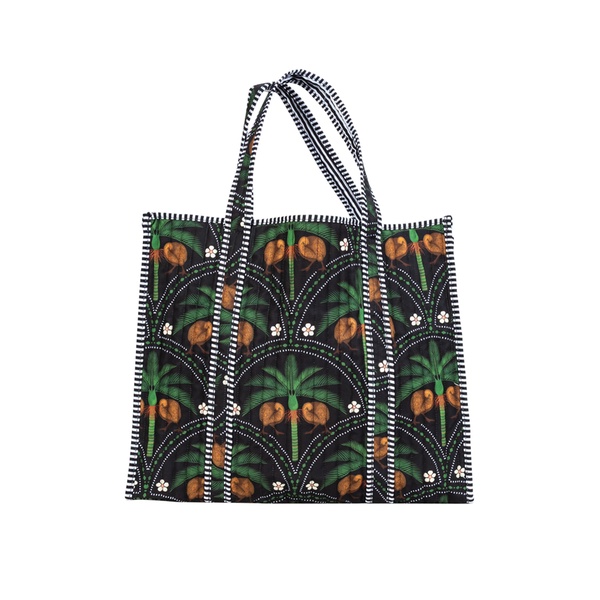 Kiwi Tropics Quilted Tote-Style Bag in Black with black and white striped lining.
