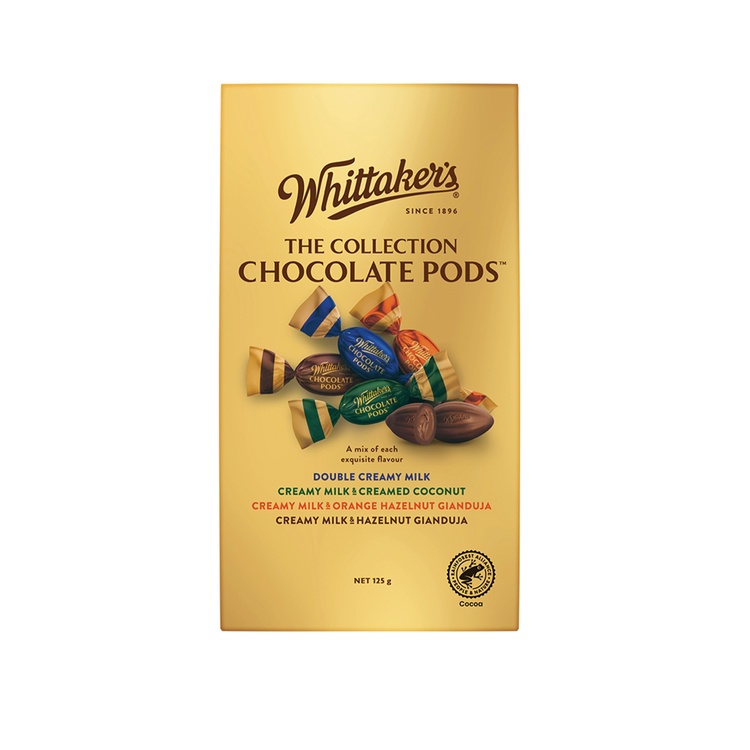 Whittaker's Chocolate Pods are a tribute to the cocoa pod and a celebration of our bean to bar craft. Just like the real thing, each Creamy Milk chocolate pod contains a treasure: in this case an assortment of velvety smooth, chocolate flavoured fillings. Double Creamy Milk, Creamy Milk and Creamed Coconut, Creamy Milk and Orange Hazelnut Gianduja, Creamy Milk and Hazelnut Gianduja.