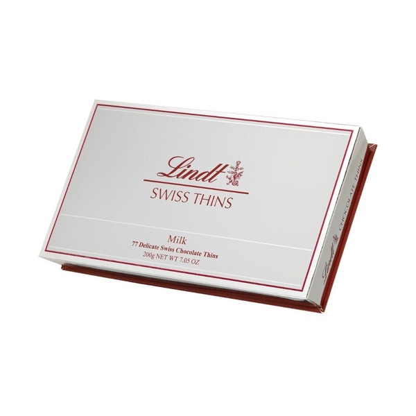 Enjoy the pure pleasure of chocolate with lindt swiss thins milk. made from the best quality ingredients, these delicately thin squares melt quickly on the tongue to release their delicious taste. indulge in this smooth chocolate delight and discover the classic recipe of swiss thins milk.