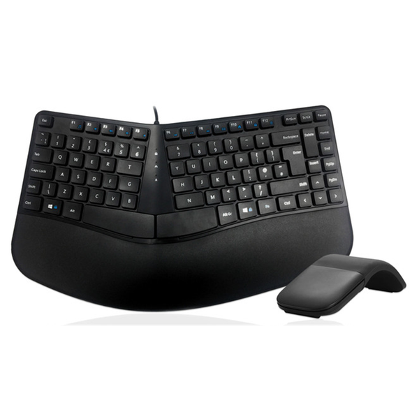 "A" shaped Natural Contour Split keyboard The compact Natural Contour split keyboard has been designed to provide a comfortable and dynamic pronated hand position with the ergonomic reverse tilt, (achievable using the fold out feet at the front of the keyboard), split keys, wide wrist rest and sculpted design. "A" shaped layout - The natural relaxed placement of the hands on the keyboard and the wide wrist rest are ideal for typing in comfort with a neutral wrist position- Sculptured and contoured design, shaped to fit the natural position of your hands and finger tips- Integrated wrist pad is shaped to follow the ergonomic design of the keyboard and to support wrists comfortably- Reverse tilt feet fitted at the front of the keyboard, means the keyboard angle can be set to a subtle reverse tilt so the wrists are in a natural position- Low profile keys are tactile and have a high life cycle membrane key mechanism offering excellent durability and feel- Keycap printing is UV coated, just like on laptop keyboards to offer a very long life and prevent character wear- Clear easy read key legends with FN key to multiplex some keys, e.g. the multimedia functions- Integrated multimedia keys for Media Player, Volume control, Media control and playback, E-mail, Internet, Calculator- Meets the definition of a "mini keyboard" (400 mm or less wide) Ambidextrous Curved Touch Mouse Bluetooth/Wireless Black