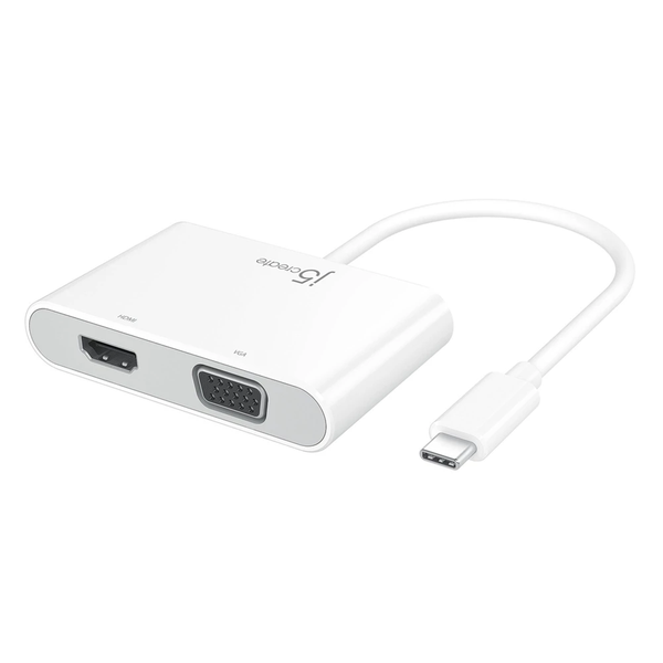 No software/drivers required The JCA175 is a lightweight and portable adapter that connects a USB-C™ to an HDMI™ and VGA monitor or projector while also connecting a standard USB™ 3.0 device and a USB-C™ charging port. It supports a video output up to 4K @ 30 Hz (HDMI™) + 1080P @ 60 Hz (VGA), which allows you to capture every detail of an image and gives you audio output to your external display through HDMI™. The USB™ 3.0 port provides data transfer speeds up to 5 Gbps, making it easy to transfer an HD movie in no time at all. The USB-C™ power delivery port supports 100W, ensuring that the computer stays powered on while the device is connected. The USB-C™ to HDMI™ supports resolutions up to 4K (3840 x 2160 @ 30 Hz) and VGA resolutions up to 1080P (1920 x 1080 @ 60 Hz) when they are used alone. It also supports mirror and extended modes when used separately. When the two output ports work at the same time, the maximum resolution of both of them together is 1080P @ 60 Hz. When working together it supports mirror mode only. This 4-in-1 adapter is plug and play with no drivers or software required. Great for use in the office, home theater, teaching, etc. The JCA175 is compatible with Windows®, macOS® and Chrome OS™ computers with a USB-C™ port. Multiple Monitors for Multi-Tasking Professionals Supports 4K HDMI™ or VGA 1080P Video Resolutions