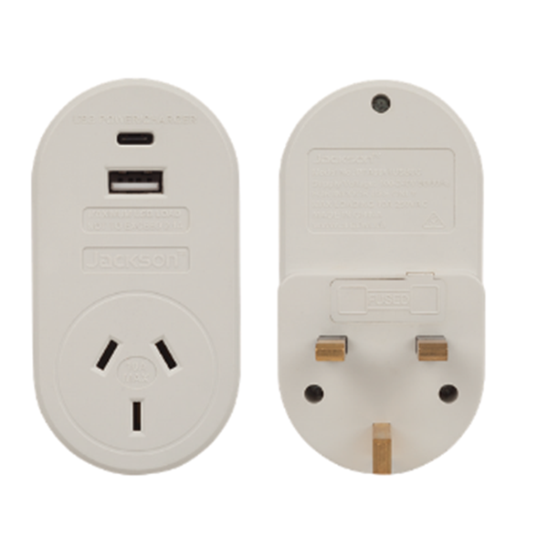 JACKSON Outbound Travel Adaptor with 1x USB-A and 1x USB-C (2.1A) Charging Ports. Converts NZ/AUS Plugs for use in UK, Hong Kong & More.