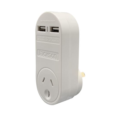 JACKSON Single Plug USB Wall Charger, 2x USB Charging Outlets (2.1A total) Power status indicator and a 240V mains outlet. This dual USB power adaptor has been cleverly designed to make the most of a single wall outlet, allowing you to fast charge (2.1A) 2 devices simultaneously whilst also maintaining your single power outlet. The compact design makes it very handy for travel, or everyday use around your home. - 2 Fast Charge USB Charging Ports- 1 Power Outlet- Compact Design- Australian Business &; Support