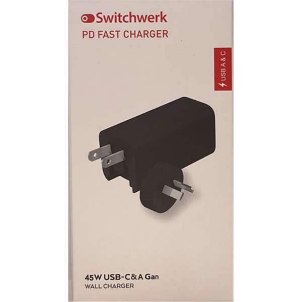 Wall Charger - Support IPhone 8 or newer series, Macbook and laptops, Nintendo Switch Dock- Fast Charging iPhone 8 Or Later - 0-55% in 30 minutes*- Compact &; Lightweight - Travel Friendly, Comes with US + AU/NZ Plugs - Convenience - Dual USB ports GaN technology Experience next-level charging with advanced GaN technology. Gallium nitride (GaN) is a high-performance alternative to the traditional silicon- based semiconductors . GaN provide faster charging and better power efficiency. Power Delivery Technology The charger uses the latest and greatest of USB-C Power Delivery technology (PD 3.0), that lets you charge a range of USB-C enabled devices very quickly with up to 45W of power. The USB-A port outputs 12W power for fast charging a second device simultaneously. Certified Safe - Meets all Safety standards Switchwerk Type-C / USB-C PD Charger 45W GAN Quick Charger