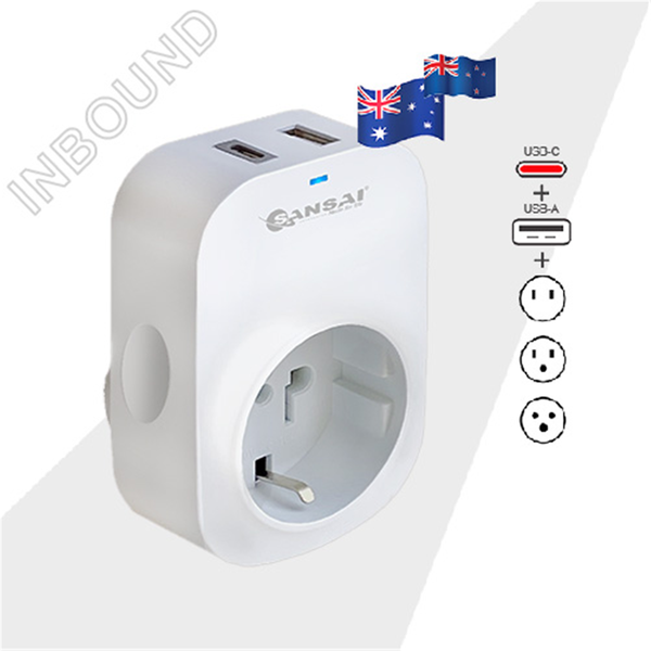 Sansai STV-607AC USB TRAVEL ADAPTER - Other countries to NZ/AU Perfect for visiting tourists to Australia &; New Zealand from the USA, Canada, Europe, Bali plus many other countries as per the list below Compatible with plugs from many countries including: Europe, Japan, Taiwan, China, USA, Canada, Switzerland Earthed, Italy Earthed, France Earthed, Germany Earthed, Bahamas, Thailand, and parts of South America.- For visiting tourists to Australia &; New Zealand- 1 Inbound outlet converting USA, Canadian, Europe &; Bali, style appliances- 1 USB-A + 1 USB-C charging outlets- Auto regulated 0 - 3.1A per port, 2 USB ports total load 3.1A max.
