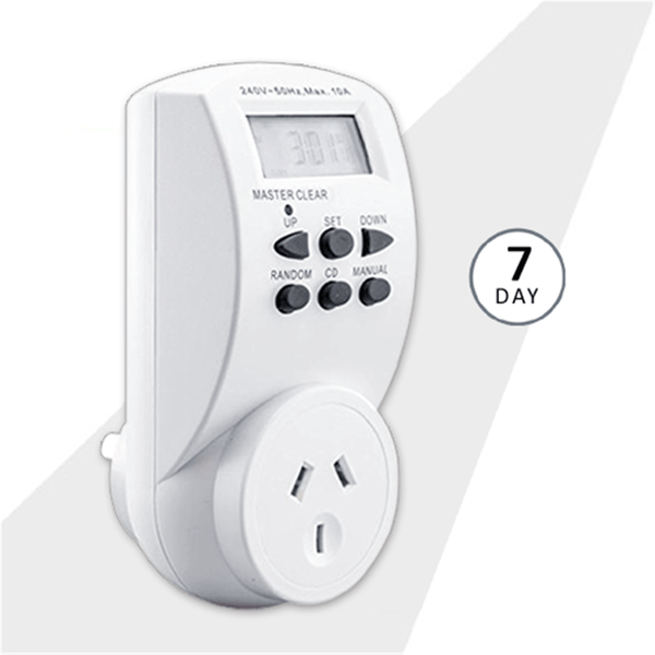Sansai PAD-031 7 Days Digital timer 7 Day Digital Timer Plug-in Switch: This 7-day digital timer has up to 10 "ON" and "OFF" switches per day and 24 hours, 7 days, weekend/weekday settings available. It also has advanced random, countdown, and summertime functions. The backup battery is rechargeable. - Program up to 20 ON/OFF per day- Minimum Timer Setting: 1 Minute- Maximum Setting: 7 Days- Summer/Winter Time Options- Big LCD Display- Totally safe totally silent- 240V ~50Hz 10A, Max. 2400W- No Moving Parts to Break- Easy Installation, Simply Plug-In *Warning: For Indoor Use Only