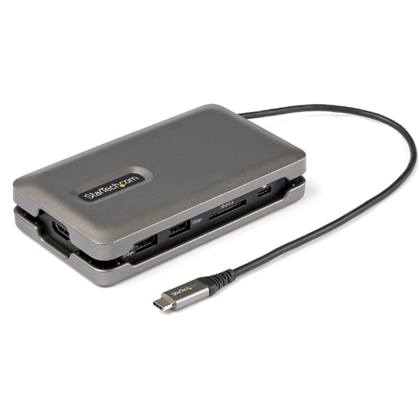 https://www.startech.com/en-us/universal-laptop-docking-stations/dkt31csdhpd3 This USB-C multiport adapter with DP 1.4 supports 4K 60Hz HDMI® (HDR) and turns your MacBook Pro, Dell XPS, or other USB-C™ laptops or tablet into a workstation, anywhere you go. The USB Type-C multiport adapter provides 4K HDMI video output, two USB 3.1 Gen 2 Type-A (10Gbps) ports, an SD card reader and a Gigabit Ethernet port all through one connection to your laptop's USB-C or Thunderbolt 3/4™ port. Plus, it offers advanced charging through USB Power Delivery 3.0 and an extra-long attached 10-inch (25 cm) host cable for an extended reach to offer more set up flexibility. USB 3.1 Gen 2 (10Gbps) is also known as USB 3.1 Gen 2x1 (10Gbps). Enhance Productivity The portable docking station connects your laptop to a 4K 60Hz HDMI monitor (4096 x 2160p) to create a powerful workstation. It can also connect to an ultrawide monitor. Connect Your Devices The USB-C to USB 3.1 Gen 2 hub gives you two USB-A (10Gbps) ports to connect your USB devices. Easy Portability For mobile use, the USB-C adapter can operate with bus-power alone, or with a USB-C power adapter for laptop and BC 1.2 peripheral charging. The docking station is lightweight and features a built-in wraparound USB-C host cable. Built-In SD Card Reader Access your multimedia content with ease. The multiport adapter provides direct access to your SD, SDHC™ and SDXC™ memory cards or microSD (uSD) cards. Charge Your Laptop and Peripherals With support for USB PD 3.0 (up to 100W), the USB Type-C multiport adapter lets you power and charge your laptop, and power your peripherals when connected to a USB-C power adapter. PD 3.0 features Fast Role Swap to prevent USB data disruption when you switch power sources (USB-C power adapter to bus power). Reliable Network Connectivity The Gigabit Ethernet port ensures reliable wired network access with support for PXE Boot and WoL.