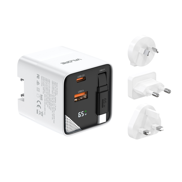Valore PD65W GaN Wall Charger with Digital Display, Built-in USB-C Cable and 2-Ports Model: PA-007AUCategory: Wall Chargers - PD65W Fast Charging - GaN Chip Technology - Charge 3 Devices Simultaneously - Retractable Cable - Digital Display - Universal Plug Input: AC 110-240V ~ 50/60Hz, 1.7A (max)Power: 65W (max)USB-C1/USB-C2 Output: 5V/3A, 9V/3A, 12V/3A, 15V/3A, 20V/3.25A (65W max)USB-A Output: 5V/3A, 9V/2A, 12V/3A, 20V/3A (60W max)USB-C1+C2 Output: 45V+20W (65W)USB-C1+A Output: 45W + 18W (63W max)USB-C2+A Output: 5V/3A (15W max)USB-C1+C2+A Output: 45W + 15W(USB-C2+A) (60W max)Materials: PCCable Length: 800mmDimension: 49.9
