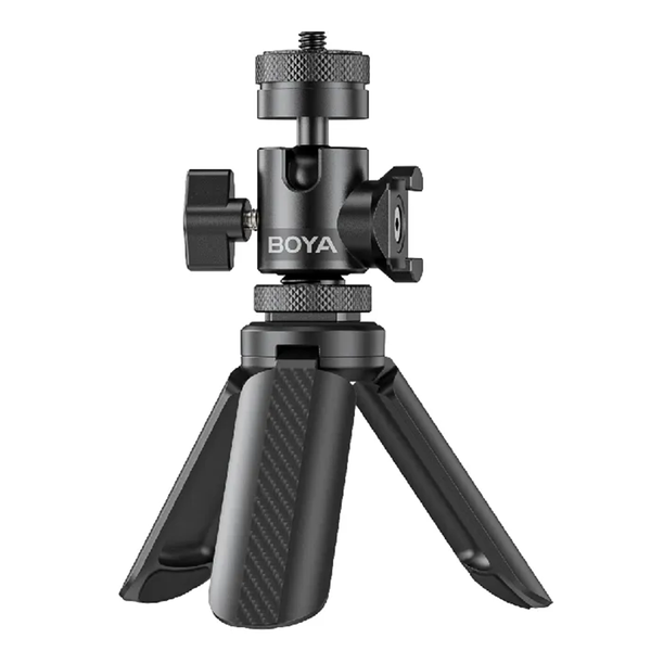 The BOYA Mini Tripod is a collapsible desktop tripod that offers flexible mounting and smooth angle adjustment in a palm-sized design. A perfect match for BOYA Magic-ideal for podcasting, meetings, and video calls. - 360° ball-joint design with side locking knob for quick and smooth angle ajustment.- Detachable upper body features a cold shoe adapter for camera mounting and a side slot for camera receiver.- Supports lightweight microphones, cameras, and accessories with 1/4" or 3/8" mounting.- Weighing just 107g with a folded length of 5.5", it's easy to store and carry.- Silicone feet keep the device securely in place for stable shooting.