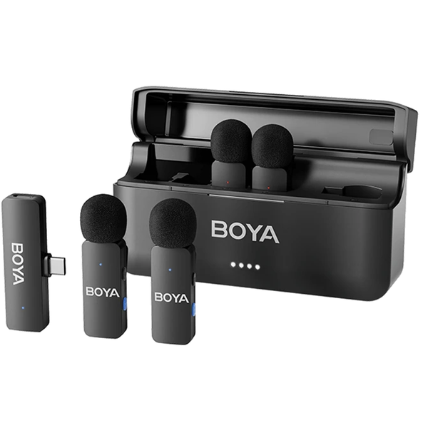 BY-V4 is a 4-channel portable wireless microphone series that supports up to 4 mics simultaneously. With dual noise cancellation, BY-V4 can capture high-quality sounds. Additionally, it work with Phones, Tablets, and Cameras with adaptors that come in the package. - Supports up to 4 mics recording simultaneously; Automatic pairing for plug-and-play- Dual noise cancellation: BOYA Audio's one-click noise cancellation tech and windshield for clear sound capture in noisy environments- The TX features a rotating clip and an omnidirectional in-built capsule, enabling sound pickup at 360°- SNR 80dB and 48 kHz 16-bit recording for better-than-CD audio recording. 120dB SPL for avoiding distortion and clipping- 2.4GHz digital frequency with up to 200m transmission range in open space- Portable charging case with battery life of up to 18 hours for the UC/DI versions, and up to 12 hours for the RX3.5 version 18H Battery Life Ensures all-day usage on set Operating Time: 6 hours(Single TX),18 hours(with Charging Case) 200m Long-Range Transmission The transmitter offers a robust 200m (650ft) range in open fields with no audio degradation One-Click Noise Cancelling Effortlessly eliminate all undesired noise with a simple click, ensuring efficiency and simplicity Support using while charging You can charge your device while recording by connecting to this port, making it convenient for long recording sessions like streaming or course recording. WIDELY COMPATIBLE Supports ios System Devices(excluding iPhone 15 series) Excellent Clear Voice With 48 kHz / 16 bit precision, our system captures real-life audio nuances with studio-grade fidelity Omnidirectional 360° sound pickup Capture audio from all directions,ensuring that no sound source is missed Four-Channel Wireless Microphone Provides seamless simultaneous audio capture from multiple sources,maximizing efficiency and flexibility in recording setups