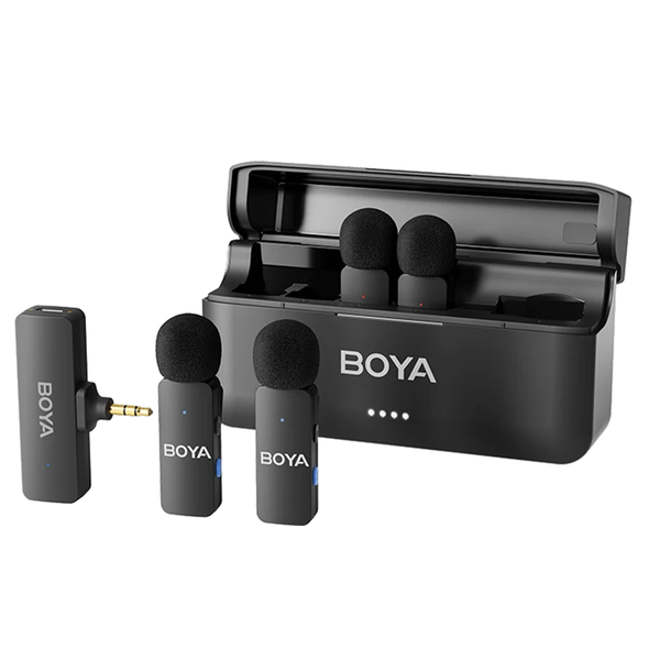 BY-V4 is a 4-channel portable wireless microphone series that supports up to 4 mics simultaneously. With dual noise cancellation, BY-V4 can capture high-quality sounds. Additionally, it work with Phones, Tablets, and Cameras with adaptors that come in the package. - Supports up to 4 mics recording simultaneously; Automatic pairing for plug-and-play- Dual noise cancellation: BOYA Audio's one-click noise cancellation tech and windshield for clear sound capture in noisy environments- The TX features a rotating clip and an omnidirectional in-built capsule, enabling sound pickup at 360°- SNR 80dB and 48 kHz 16-bit recording for better-than-CD audio recording. 120dB SPL for avoiding distortion and clipping- 2.4GHz digital frequency with up to 200m transmission range in open space- Portable charging case with battery life of up to 18 hours for the UC/DI versions, and up to 12 hours for the RX3.5 version 18H Battery Life Ensures all-day usage on set Operating Time: 6 hours(Single TX),18 hours(with Charging Case) 200m Long-Range Transmission The transmitter offers a robust 200m (650ft) range in open fields with no audio degradation One-Click Noise Cancelling Effortlessly eliminate all undesired noise with a simple click, ensuring efficiency and simplicity Support using while charging You can charge your device while recording by connecting to this port, making it convenient for long recording sessions like streaming or course recording. WIDELY COMPATIBLE Supports ios System Devices(excluding iPhone 15 series) Excellent Clear Voice With 48 kHz / 16 bit precision, our system captures real-life audio nuances with studio-grade fidelity Omnidirectional 360° sound pickup Capture audio from all directions,ensuring that no sound source is missed Four-Channel Wireless Microphone Provides seamless simultaneous audio capture from multiple sources,maximizing efficiency and flexibility in recording setups