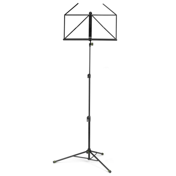 Folding Music Stand with Carry Bag - Stable tripod base construction with strong steel tubing- Newly designed clamping collars for quick and easy height adjustment- Secure desk tilt adjustment- Folding instructions printed on the desk- Neoprene carry bag included This all-steel tripod music stand and tilting desk fold down to a compact size for easy portability Providing improved stability, the legs are made of heavy duty tubing while redesigned clamping collars permit ultra quick and easy height adjustment without set screws from 67 to 138 cm lip to floor. To facilitate handling, the folding instructions are printed on the rear of the desk. The music stand comes with a convenient carry bag made of neoprene.