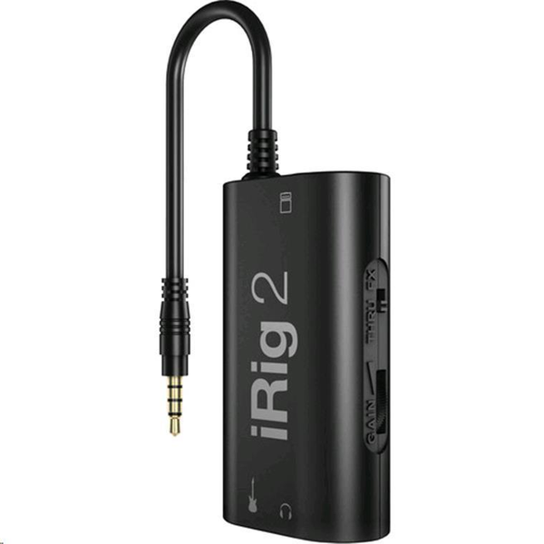 IK Multimedia iRig 2 - Guitar Interface for iPhone, iPad, iPod Touch, Mac, and Android The iRig 2 from IK Multimedia is a guitar and bass audio interface designed for use with iPhone, iPod Touch, iPad, Mac, and Android devices. The included AmpliTube Free software delivers a portable, yet powerful virtual guitar rig for performances, recording, rehearsals, practice, and more. Enjoy the same processing, low-latency amplifiers, speaker cabinets, stompbox pedal effects, microphone modeling and accuracy as the Mac/PC versions.Effortlessly combine an entire rig of 3 simultaneous stompboxes, amp head, speaker cabinet, and microphone in order to achieve that ideal tone for your guitar or bass. The compact interface features a 1/4" instrument input to your portable i-series device, and a dedicated 1/4" amplifier output with an 1/8" line output for headphone monitoring or connecting to a PA system. There is a selectable dual-mode switch for FX and THRU, which allows you to process your instrument or pass the signal through unaltered. A dedicated gain control thumbwheel allows you to dial in the optimum setting.The interface is also compatible with Android devices that support the CTIA/AHJ wiring standard and may be used with the optional AmpliTube for Android software. The iRig 2 ships with a detachable microphone stand hook and loop fastener-slot and a hook and loop fastener strip.- 1/4" instrument input for use with guitar, bass and other instruments- 1/4" amplifier output for use with an external amplifier without an adaptor- 1/8" TRRS output for use with iPhone, iPad, iPod touch, Mac and Android- 1/8" headphone output- Compact and lightweight design- Selectable dual-mode switch: FX and THRU- Input gain thumbwheel for easy signal control- Comes with microphone stand hook and loop fastener strip- Comes with AmpliTube FREE and a full suite of IK applications and software