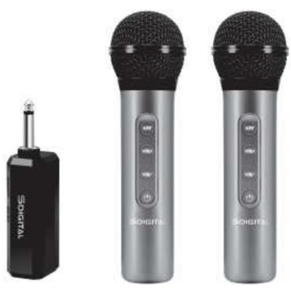 SEM2203 - S-DIGITAL DUAL WIRELESS MIC PACK Introducing our advanced wireless microphone system for distortion-free vocal clarity. With a 15m wireless range and a universal 6.3mm receiver, enjoy freedom of movement and compatibility with various devices. The USB Type-C charging ports ensure quick and convenient charging - no more batteries! Take command of your audio with remote volume control and five dynamic sound effects. The system includes