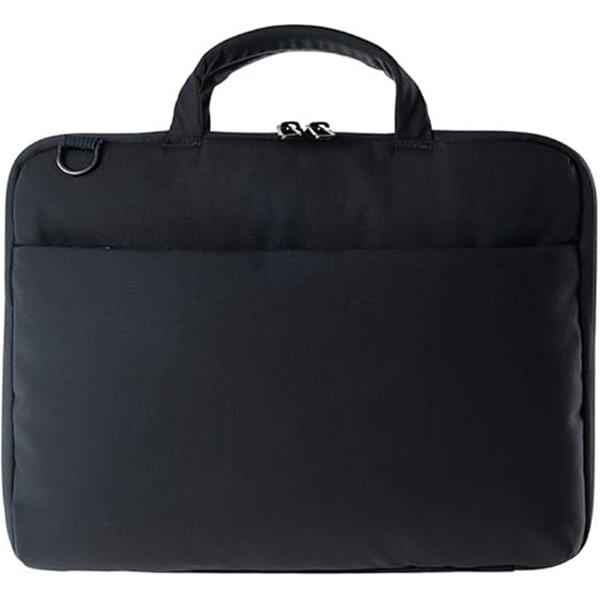 Ultra-protective slim bag for laptop 14" and MacBook Pro 14'' made with fabric produced from recycled plastic featuring a semi-rigid back panel. The spacious interior compartment, accessible via the zipper opening on three sides of the bag, allows you to work with your device by securing the edges with the two elastic corner bands. Comes with a removable, padded shoulder strap. - Ultra-protective slim bag featuring a semi-rigid back panel- Internal safety strap to secure your Laptop- Made with fabric produced from recycled plastic- Zip can be opened on three sides- Removable padded shoulder strap