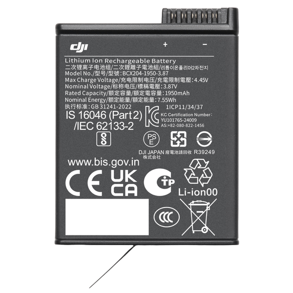 DJI Osmo Action Extreme Battery Plus (1950 mAh) This high-capacity 1950mAh battery is designed to withstand low temperatures and reliably operate in environments ranging from -20° to 45° C. Tips Compatible only with the Osmo Action Multifunctional Battery Case 2, not compatible with the Osmo Action Multifunctional Battery Case.