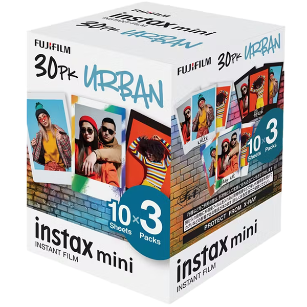 Bring a simple, classic, or edgy look to your printed films with the Instax mini Film Urban! This fantastic bundle comes with 30 films that are perfect to use with all Instax mini format cameras. It also equips professional-grade instant film technology, delivering superb image quality, sharpness, and colour accuracy. Stellar Quality The Instax mini Film Urban pack boasts stunning quality, vibrant colours, natural skin tones, and excellent detail. Print and Share Ideal for sharing with your friends and family, this generous pack lets you instantly print photos of your favourite moments. Easy to Display These stunning instant pictures can be carried in your wallet or displayed in mini photo frames and scrapbooks. Compatible Cameras This instant film bundle works with Fujifilm's Instax mini camera models. What's in The Box Capture more memories and print more photos! This pack contains three boxes, each filled with ten sheets (get thirty films in total).