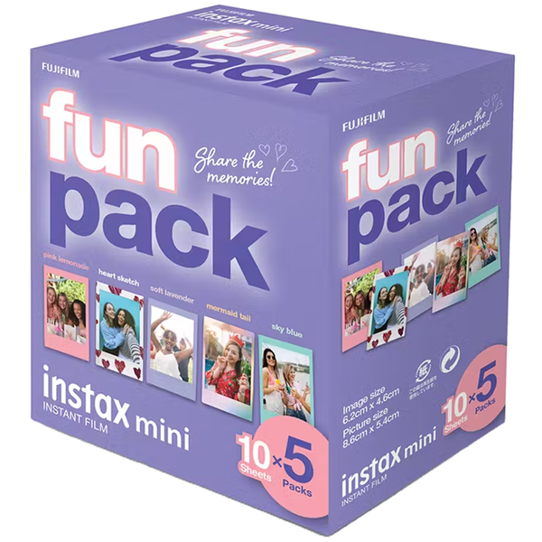 Infuse your photo prints with a charming touch using the Instax Mini Film Fun Pack! Perfect for your instant camera, this pack comes with a total of 50 film sheets that you can use for a variety of special occasions. It also comes in five unique designs, including Pink Lemonade, Heart Sketch, Soft Lavender, Mermaid Tail, and Sky Blue. Plus, it flaunts a compact 8.6cm x 5.4cm size, so you can easily bring it anywhere and share it with your loved ones. Picture Perfect Bundle Add a dash of charm and joy to your photo prints using the Instax Mini Film Fun Pack! Perfect for different special occasions, this bundle offers a total of 50 film sheets in different stunning designs. Love in Every Frame With the 10-sheet Heart Sketch Instant Film, you can now show your love to your family, friends, and special ones. Colourful Memories Await Bring a pop of colour to your photos! This bundle comes with Soft Lavender, Sky Blue, and Pink Lemonade Instant Films, which contain 10 sheets each. Dive into Enchantment The Mermaid Tail Instant Film flaunts a unique and soft gradient frame that is sure to elevate your instant photographs. Print and Share Ideal for sharing with your friends and family, this generous pack lets you instantly print photos of your favourite moments. Seamless Installation The film cartridges are specially engineered and labelled for effortless loading. Compact Size Each film features a small 8.6cm x 5.4cm size that you can seamlessly slip into pockets and purses. What's in the Box The package contains 1 x 10pk Pink Lemonade, 1 x 10pk Hearts Sketch, 1 x 10pk Soft Lavender, 1 x 10pk Mermaid Tail, and 1 x 10pk Sky Blue.
