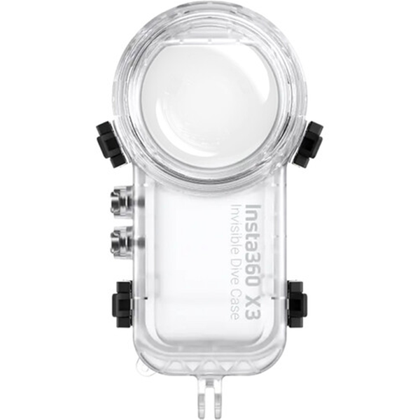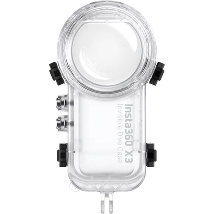 Insta360 Invisible Dive Case for X3 Film improved diving shots from deep below the surface of the water using this Invisible Dive Case from Insta360. Custom-fit to your X3 camera and designed to compensate for water refractions, the clear case maintains visibility of your touchscreen and controls while ensuring seamless 360° video. It has a waterproof depth rating of IPX8 capable of being submerged up to 164'. A built-in 2-prong mount attaches the case to selfie sticks or mounts of your choice and can be adapted to a 1/4"-20 compatible thread with the included adapter. Key Features - For Insta360 X3 Camera- Invisible in 360° Video- 164' Waterproof Depth, IPX8- Maintains Access to Button Controls- 2-Prong Mount- Compensates for Water Refraction